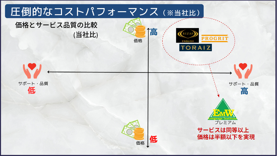 マーケティング費用にお金をかけずYOUTUBEとSNSのみで集客する超効率経営だからです。大手が高いのは電車内のぶら下げ広告やgoogle広告などに莫大な資金と投入して自社オフィスとコーチングスタッフを抱えているからです。EMWは私自身が語学のプロとして発信して、数名のスタッフに事務を手伝っていただいている超効率経営です。だからサービス品質を保ったままで費用は抑えられるのです。