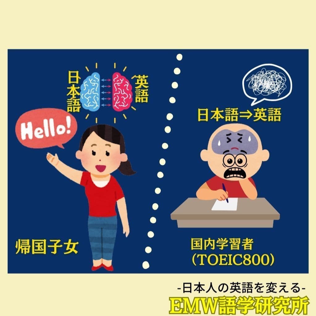 国内学習者は日本語で考えて、英文法を通して知っている英単語に訳して英語をしゃべります。そのため、非常にぎこちない英語になり、ネイティブには理解しづらい英語になりがちです。それに対して帰国子女は日本語を介さずに直接英語で考えてしゃべっているためスムーズに会話ができます。その違いは言語サークルのC-zoneにあります。正しく英語を学べば帰国子女でなくともスムーズな英語はしゃべれるようになります。