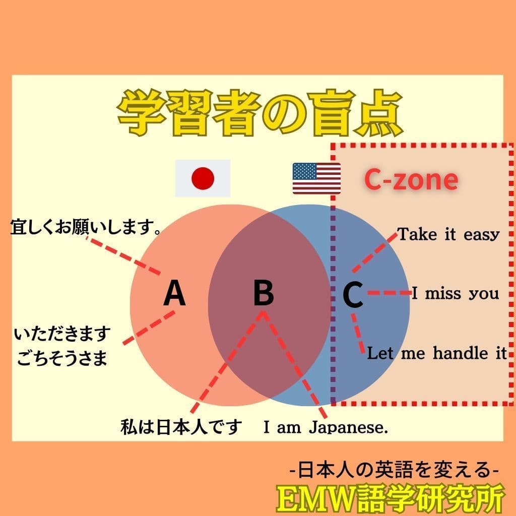日本語と英語という言語はイメージ図のように重なり合ってますが、日本語だけのAゾーンと英語だけのCゾーンがあります。日本語の『よろしくお願いします』を全く同じ意味の英語にすることはできません。なぜなら、これは日本語独特の表現だからです(=Aゾーン)。同じように”Take it easy”や"I miss you"などネイティブが日常で使う英語表現は同じ日本語にはできないのです(=Cゾーン)。