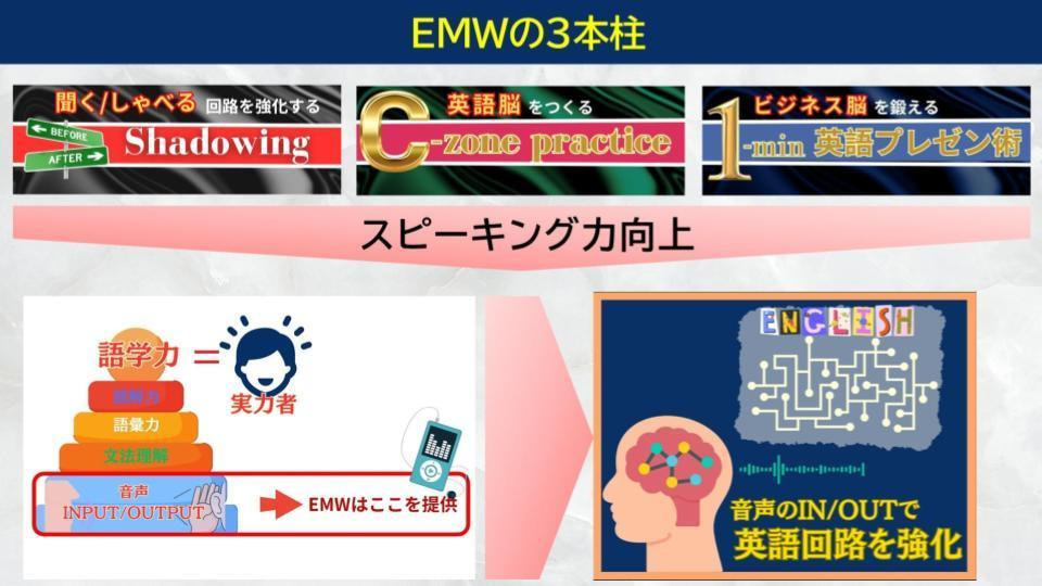 EMWの基本コースは6か月で3本柱のカリキュラムをきっちりこなして頂きますが、受講費用は大手英語コーチング3か月の料金よりはるかに安価です(実質1/3)。他社のようにマーケティングに莫大な費用は費やさず独自開発教材により安価で質の高いサービスを実現しております。