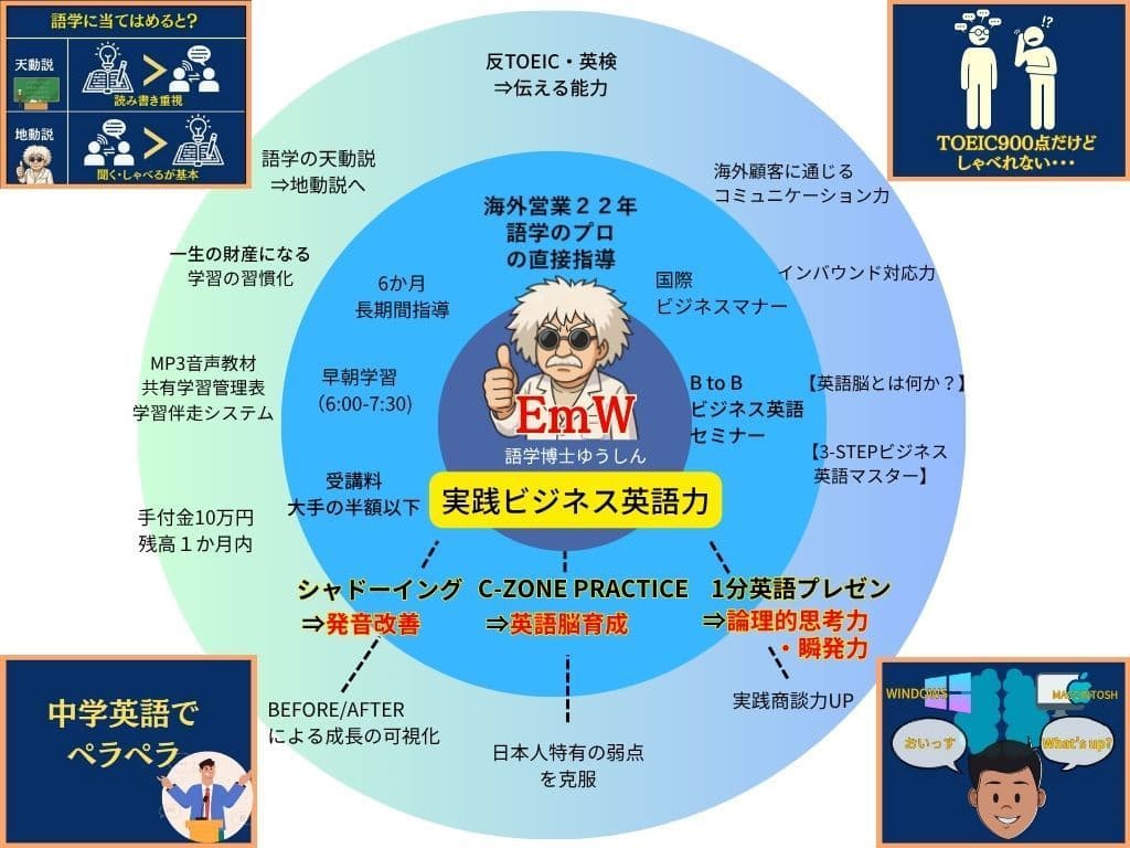 日本経済の長年の低迷と少子高齢化が急速で進む現在、実践的な英語力をつけておくことはビジネスマンとして最低限のスキルです。しかし、従来のTOEIC中心の学習では決して実践に直結する実力は身に付きません。